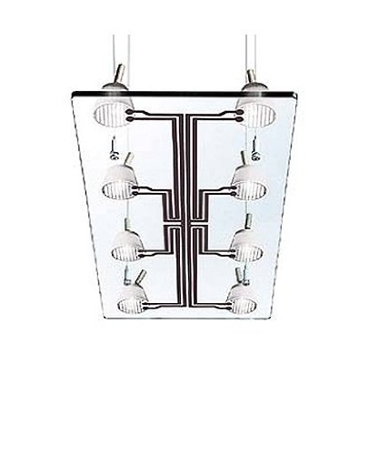 Lastra 8 Suspension Light?Flos, Lastra 8 Suspension LightSuspension fixture providing direct light. Lamp body formed by a rectangular, 0.6 in. transparent tempered glass sheet. 6 pressed glass diffusers with high-temperature resistant white finish. Injection-molded transparent polycarbonate (UL-94 V2) diffuser support and white PPS (UL-94 V0) lamp-holder. Aluminum attachment grid. Power is distributed to the light sources through two silkscreening processes: deposition of a highly conductive silver paste, followed by deposition of a protective ceramic paint. Electronic transformer secured to sheet. 4 steel suspension cables and 4 mechanical, die-cast, polished aluminum ceiling fittings, with built-in quick adjustment cord. 30% fiberglass reinforced polyamide (UL-94 V2) wired ceiling fitting; painted Grey, injection-molded polycarbonate (UL-94 V2) rose.