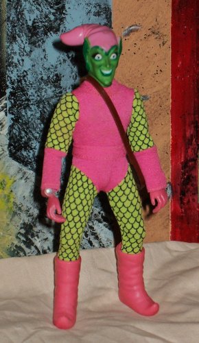 #In 1972 the Mego Corporation started to produce a line of action figures of popular comic book character's. The line was called The World's Greatest Super Heros. The Green Goblin comes with a brown plastic shoulder bag, pink plastic boots and a one piece outfit with a cloth sitched belt.