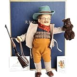 TEDDY ROOSEVELT - MISSISSIPPI BEAR HUNT by R. JOHN WRIGHT [Toy]R. John Wright, Teddy Roosevelt Teddy Roosevelt With Captured Bear Cub Faithfully Based On Vintage Illustration! Introducing a new technology, this 15" doll is the first made with a body of custom molded felt... not stuffed like previous RJW dolls. Teddy is the image of the 26th president with hand-painted features and mohair wig and moustache. His 5-way jointed body sports an authentically tailored costume of felt, real crystal wire rim hinged spectacles, and hand-cobbled leather boots with laces. Across his chest is a double row of miniature metal bullets. In one hand he holds an exact replica of T.R.'s rifle, custom made of wood and metal, and in the other outstretched arm he holds a 4" removable frightened mohair bear cub with glass eyes and resin claws.