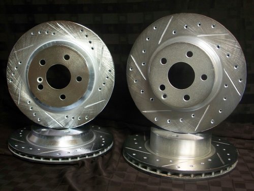 Drilled Slotted Rotors are brand new. CnC Machined in the USA. Cross Drilling allows the discs to properly ventilated gas heat between the disc infrastructure. Slotting allows the gas heat to dissipate between the brake pad and Rotor. Discs come with an anti-rust coat. Our house OE Formula pads are included. Pads improve shorter stopping distances, promote longer rotor and pad life. Pads also have a high threshold to heat and are fade resistant.